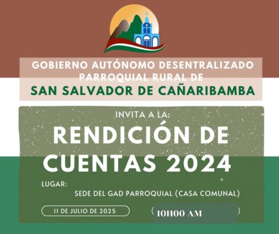 EL GAD PARROQUIAL SAN SALVADOR DE CAÑARIBAMBA TIENE EL HONOR DE INVITAR A USTED AL EVENTO DE RENDICIÓN DE CUENTAS DEL AÑO 2024, QUE TENDRÁ LUGAR EL DÍA VIERNES 11 DE JULIO DE 2025 A PARTIR DE LAS 10H00, EN EL SALÓN DE REUNIONES DE LA CASA COMUNAL PARROQUIAL.